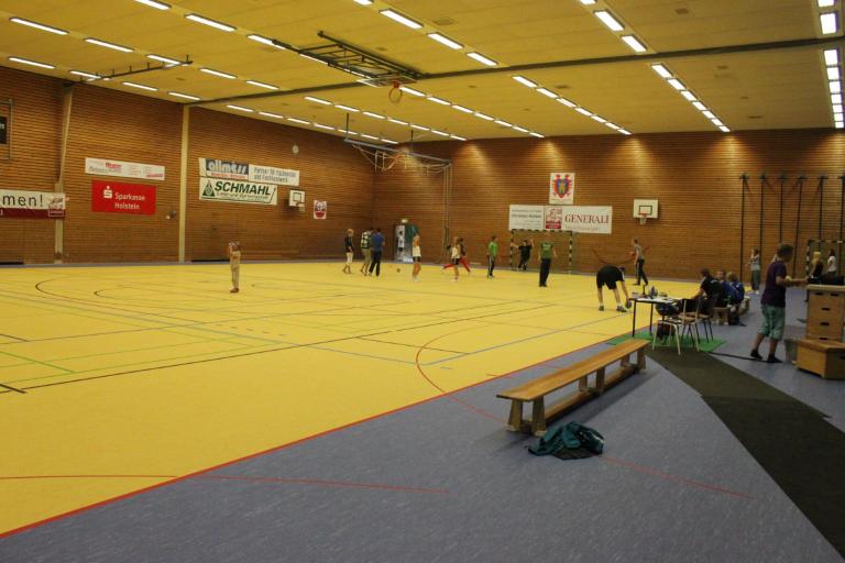 Spielfeldmarkierungen sind vorhanden für: Handball. Volleyball, Basketball, Badminton, Hockey